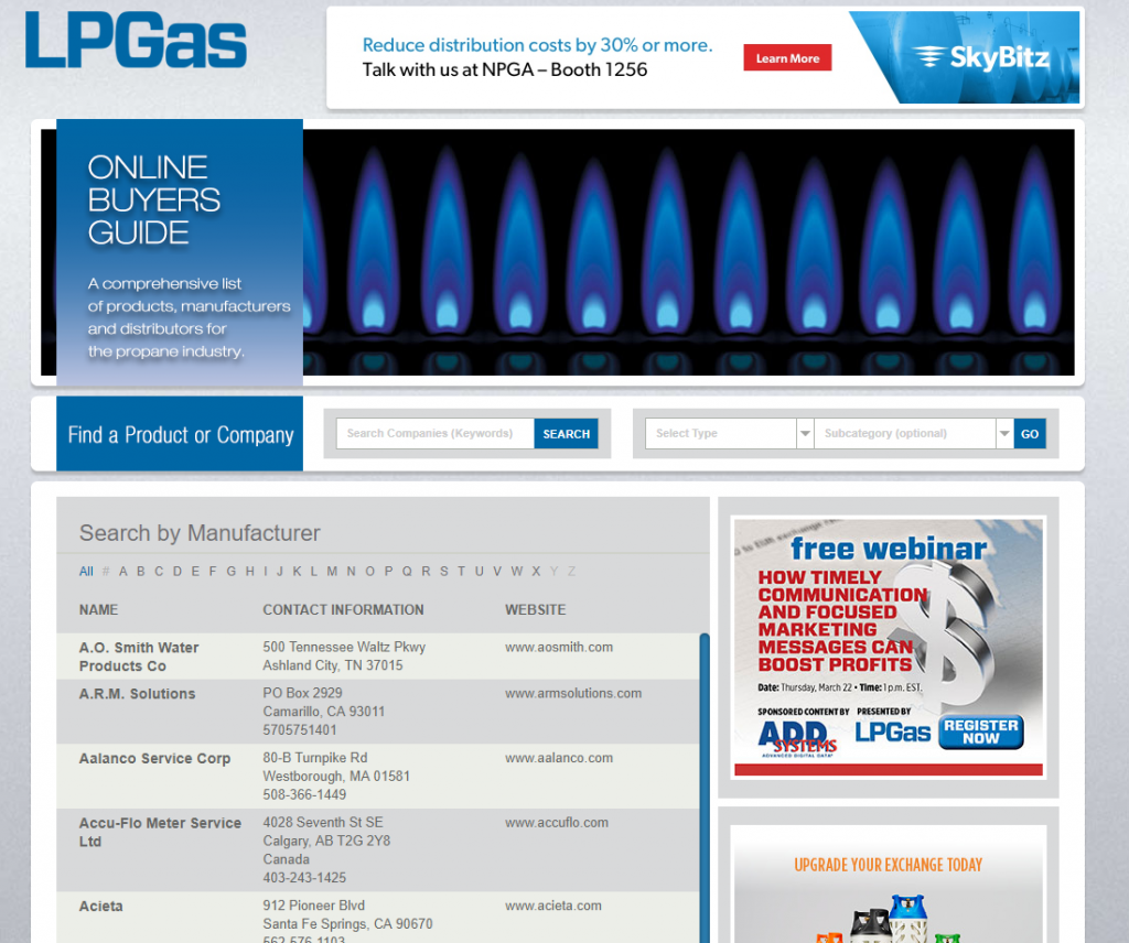 The LP Gas Online Buyers Guide is a comprehensive reference tool readers rely on all year long. It includes the most up-to-date collection of propane-related products and services, and equipment manufacturer and distributor listings, in the industry. LP Gas is the only propane industry resource that offers both a print and online version of its Buyers Guide.